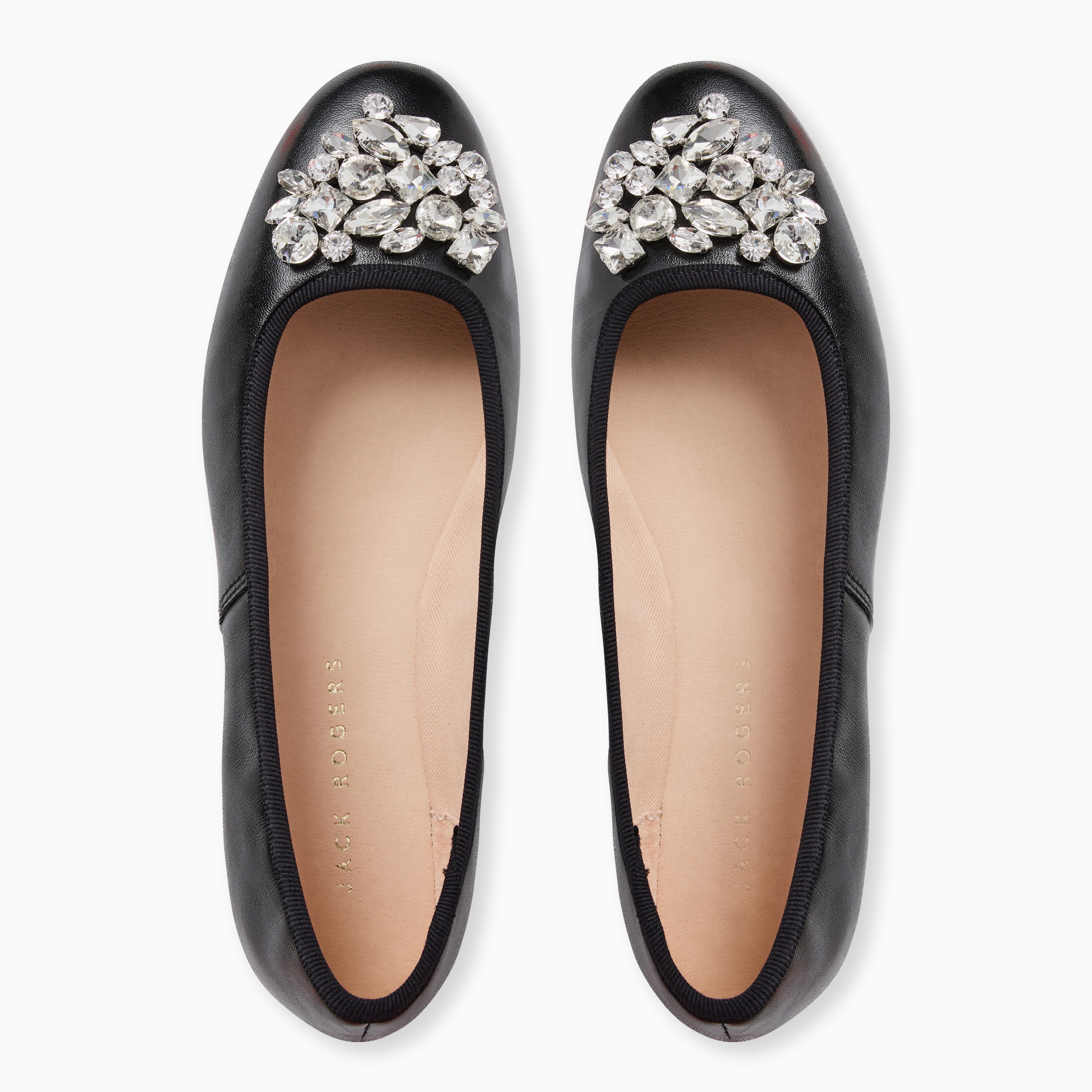 Add a touch of shimmer to your season with the Jack Rogers Ellina Jeweled Ballet Flat in black leather. Crafted from sleek metallic Nappa leather with a soft cotton lining and cushioned insole, these embellished flats for women deliver all-day comfort with a festive flair. A jeweled accent adds just the right amount of sparkle, making them the perfect pairing for cocktail attire, evening looks, or any occasion when you want to shine—no heels required.